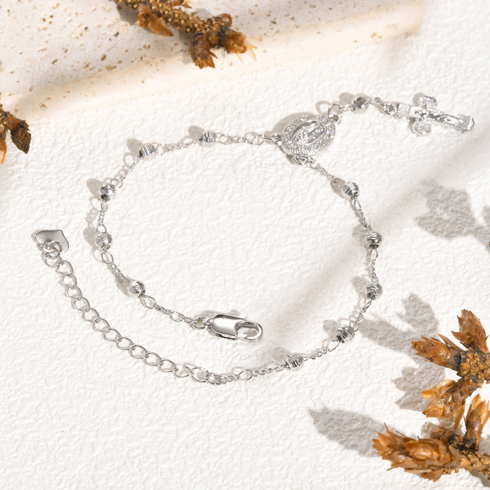 Ce bracelet (proposé en trois styles délicats) associe des crucifix en métal poli, des médailles de la Vierge Marie et des accents subtils, alliant un design doux à un symbolisme sincère pour créer un compagnon fidèle au quotidien. - Fabriqué avec soin