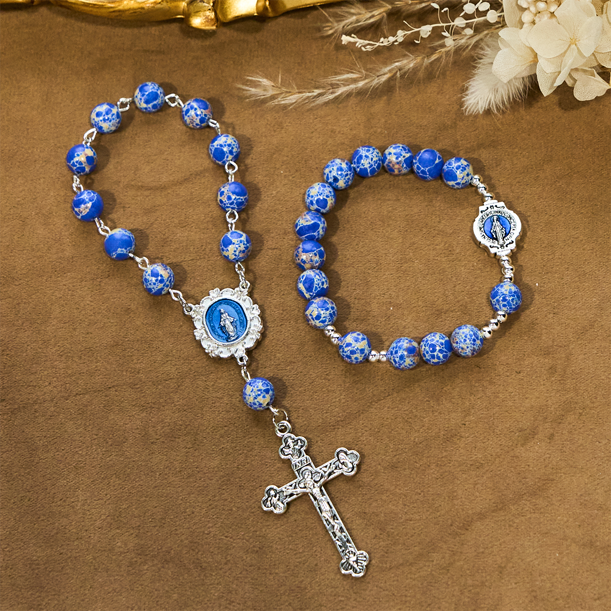 Conçu comme un chapelet à une dizaine, ce modèle se glisse facilement dans une poche ou la main, idéal pour la prière quotidienne, les moments de recueillement ou les voyages. Le contraste du bleu profond et de l'argent poli évoque la quiétude des nuits étoilées illuminées par la foi.