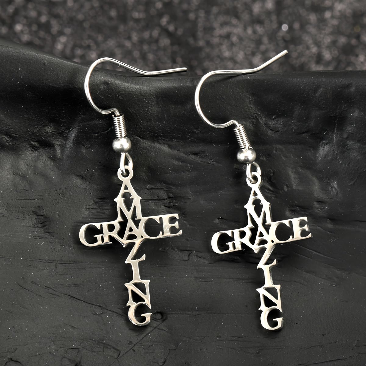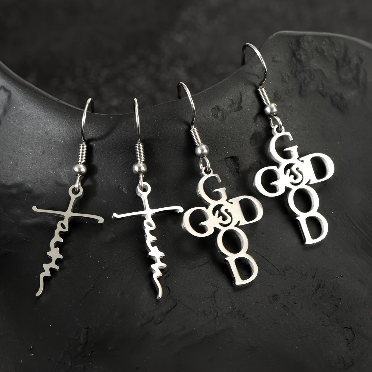 Cette collection de boucles d'oreilles (proposée en deux tons) fusionne des motifs de croix avec des phrases significatives comme « GRÂCE », « DIEU » et « FOI », associant un design ajouré élégant à des thèmes spirituels sincères pour créer des rappels de croyance à porter au quotidien. - Conçu pour un confort quotidienFaçonné avec soin dans un métal léger aux lignes épurées, ce bijou allie un style discret à des détails soignés. La croix et les mots symboliques qui ornent chaque paire en font un compagnon fidèle au quotidien.