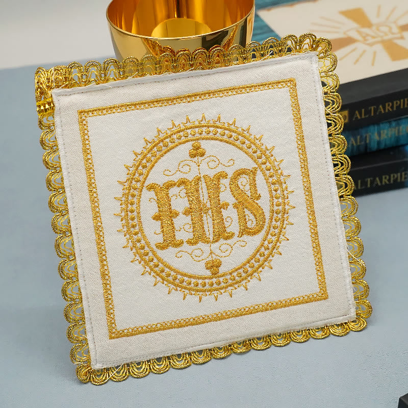 Ensemble complet : Cet ensemble comprend un voile de calice et des purificatoires assortis, offrant tout le nécessaire pour couvrir et entretenir le calice sacré pendant la messe. Chaque élément est conçu pour répondre aux plus hautes exigences liturgiques. - Améliorez votre expérience de culte