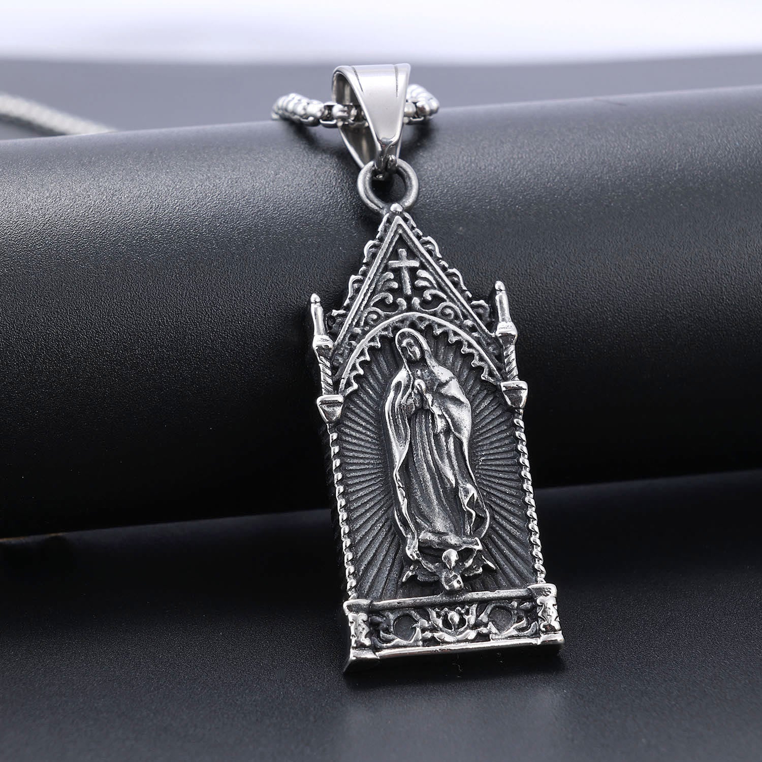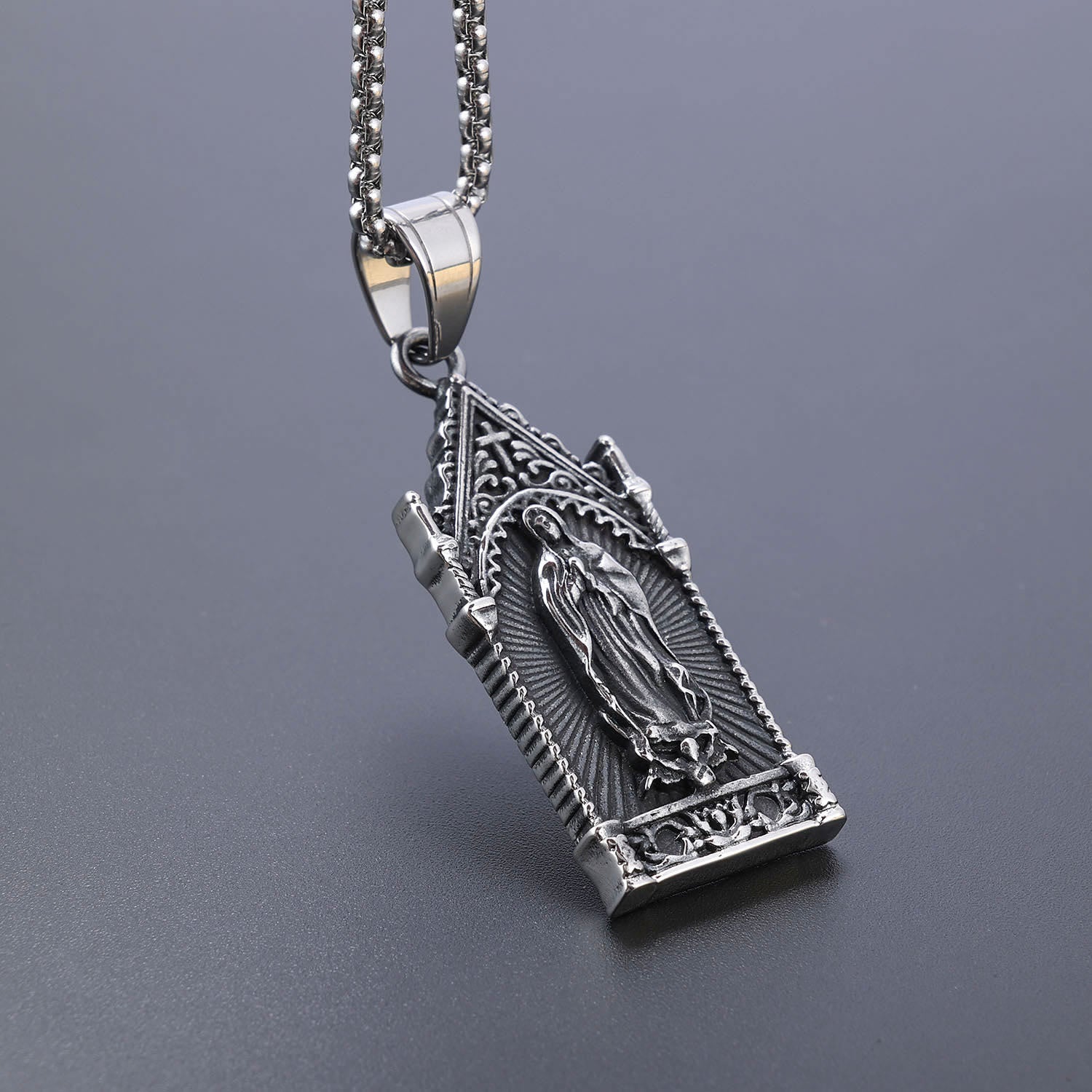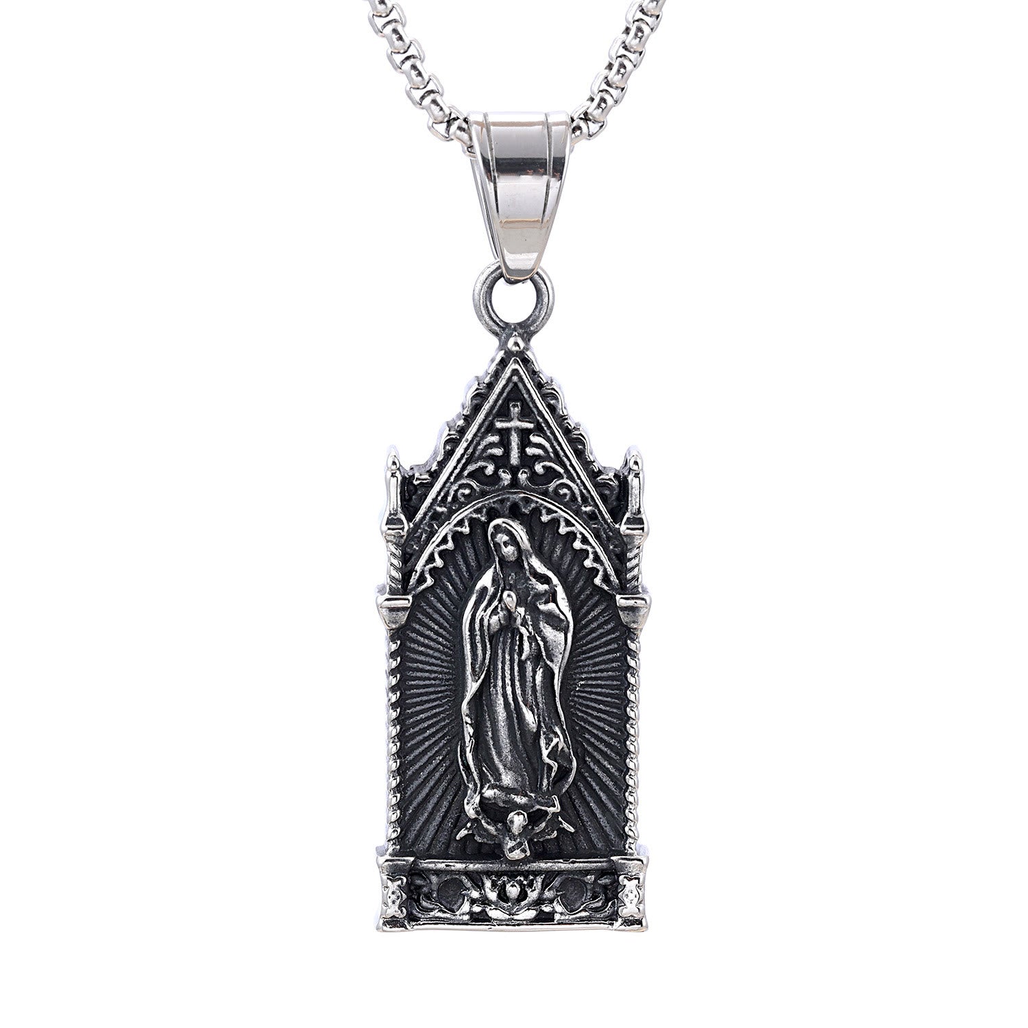 Collier antique en argent de la Vierge Marie dans un cadre de style cathédrale gothique