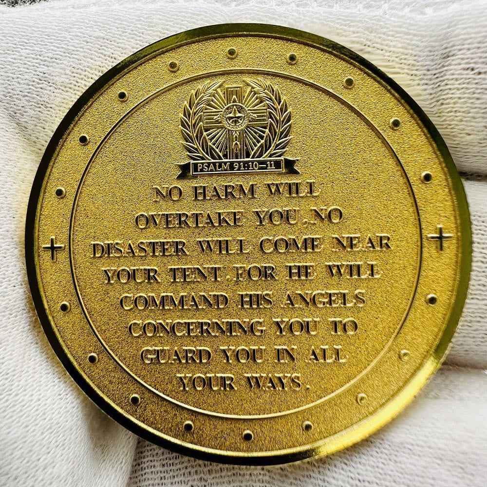 Inscription biblique inspirante : Le revers de la pièce est gravé du Psaume 91:10-11, un verset puissant qui offre protection et réconfort divins. On y lit : « Aucun mal ne t’atteindra, aucun fléau n’approchera de ta tente. Car il donnera des ordres à ses anges à ton sujet, afin qu’ils te gardent dans toutes tes voies. » Cette promesse sacrée nous rappelle constamment la protection divine.