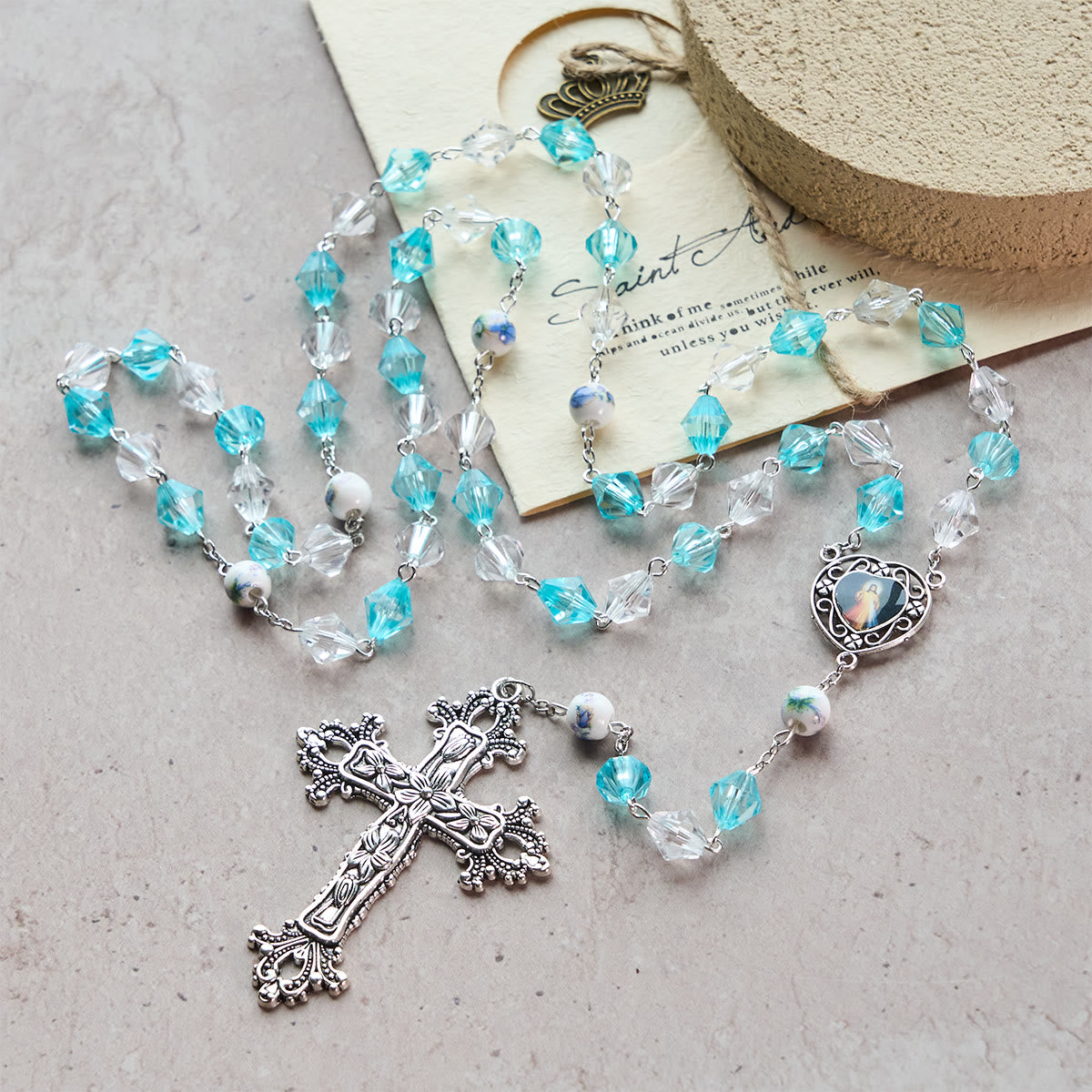 Que ce chapelet soit votre doux compagnon de prière. En parcourant les grains d'un blanc turquoise, le cœur de la Vierge Marie vous rappelle sa tendresse, transformant la lumière des grains en un lien tangible avec la chaleur divine. - Priez dans la lumière de sa grâce