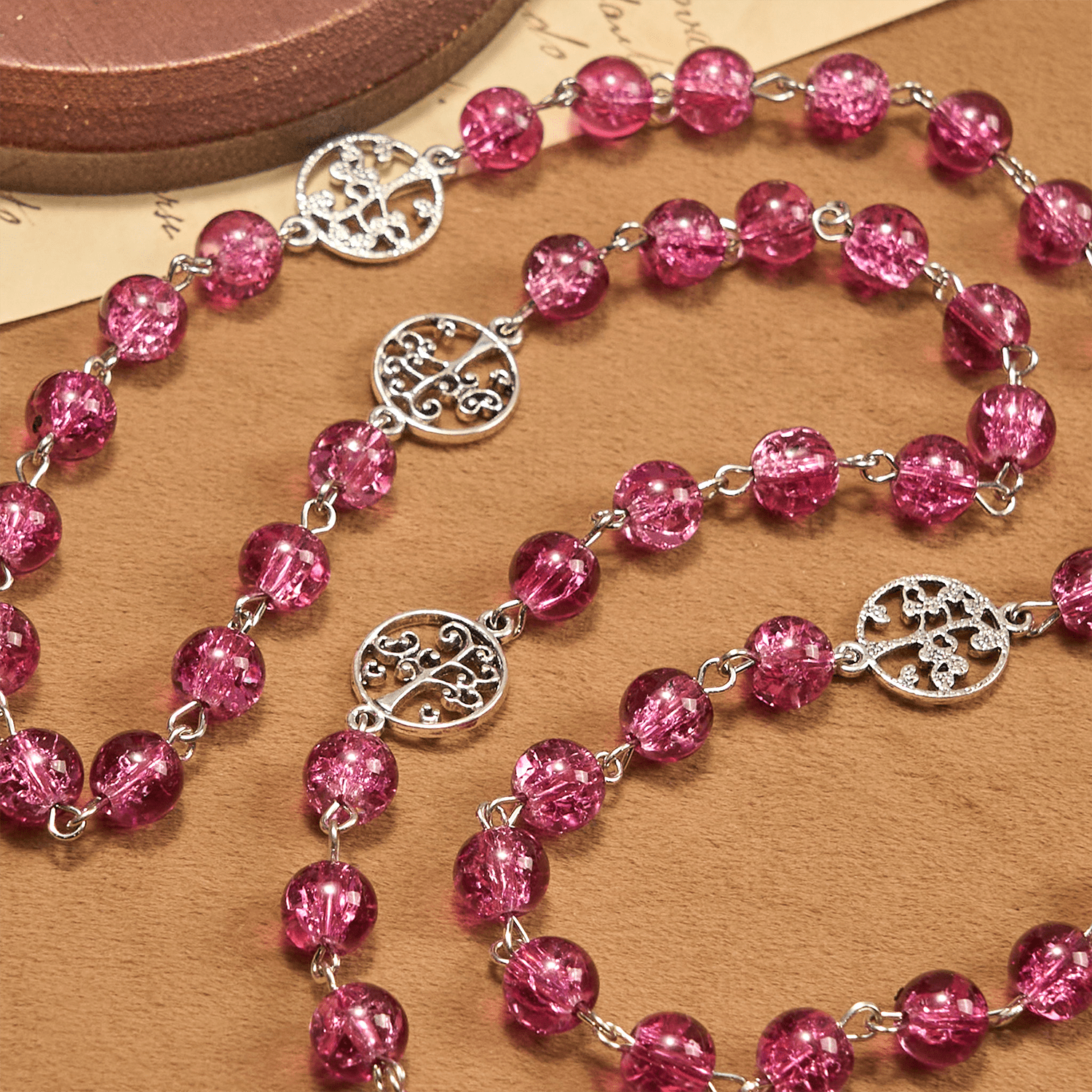 Les perles de verre rose sont sélectionnées à la main pour leur clarté et leur teinte profonde, et résistent à l'usure tout en conservant leur éclat lumineux. Les accessoires métalliques, des connecteurs ouvragés au pendentif encadré, bénéficient d'une finition raffinée et d'un traitement anti-oxydation pour une beauté durable. De la rondeur parfaite de chaque perle aux détails précis de l'image de Guadalupe, des normes de qualité rigoureuses font de ce chapelet un précieux souvenir religieux. - Grâce rituelle, élégance quotidienne