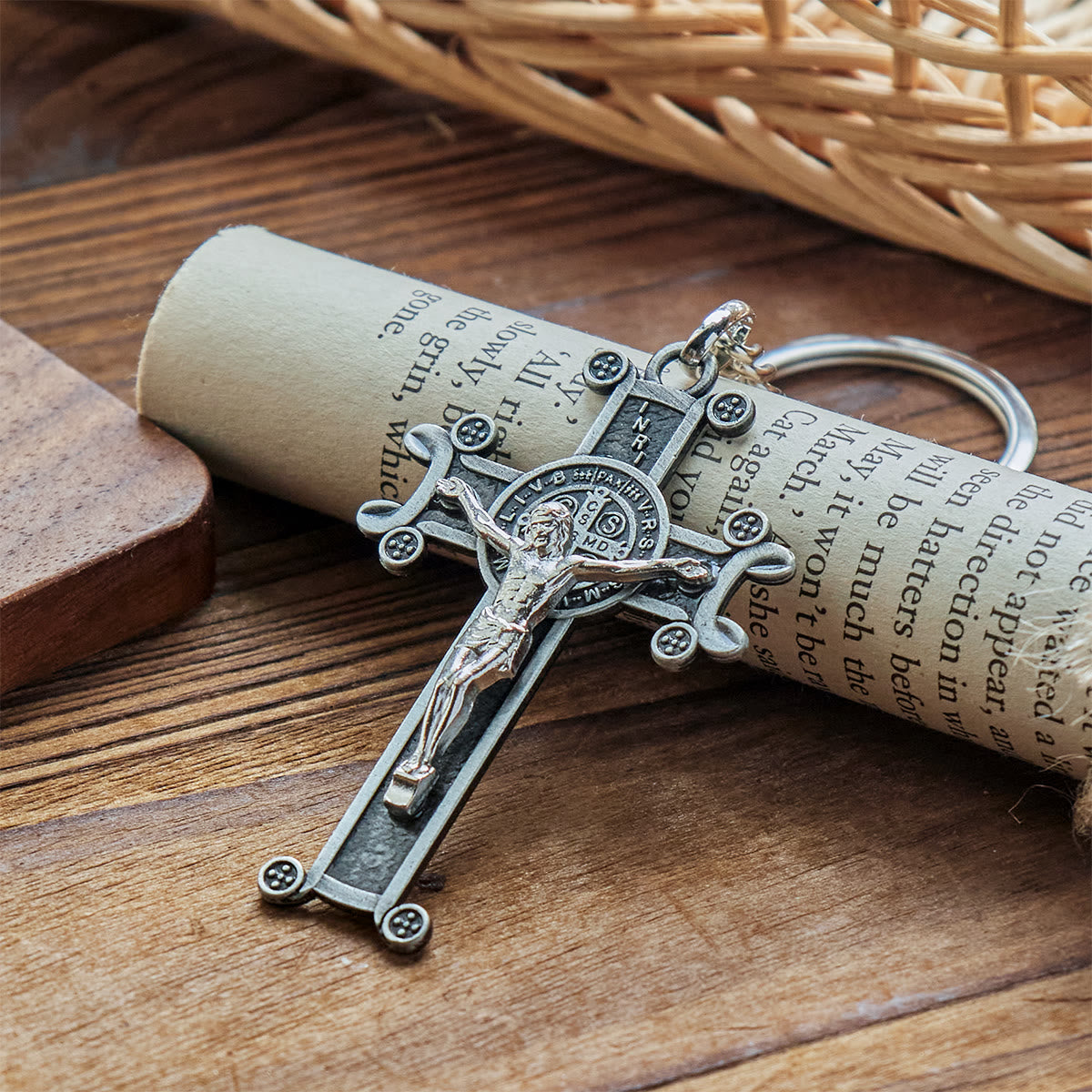 Ce porte-clés crucifix unit le symbole profond de la Croix à la force spirituelle de la médaille de saint Benoît, vous permettant de garder à portée de main le sacrifice salvifique du Christ et la protection divine. - Le crucifix – Un témoignage d’amour et de rédemption