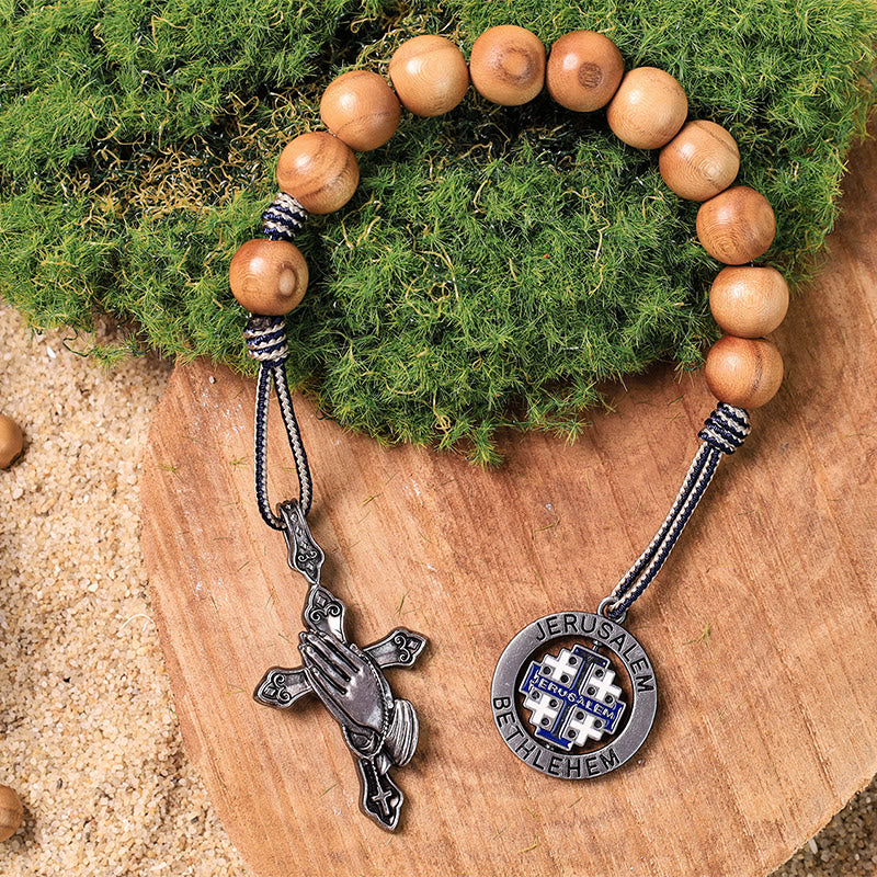 Médaille des mains en prière et de Jérusalem : Chapelet de poche en bois d'olivier béni
