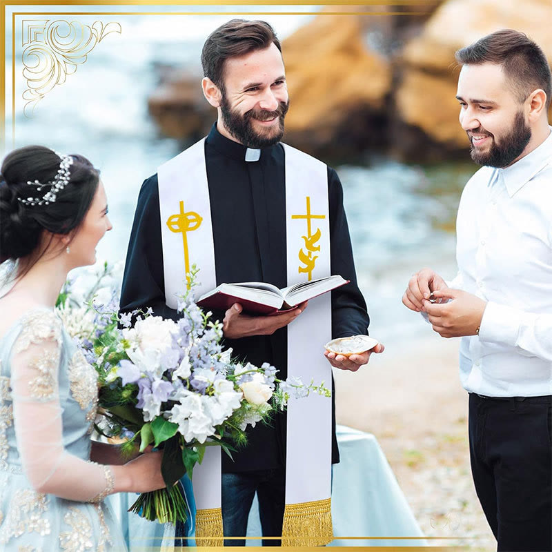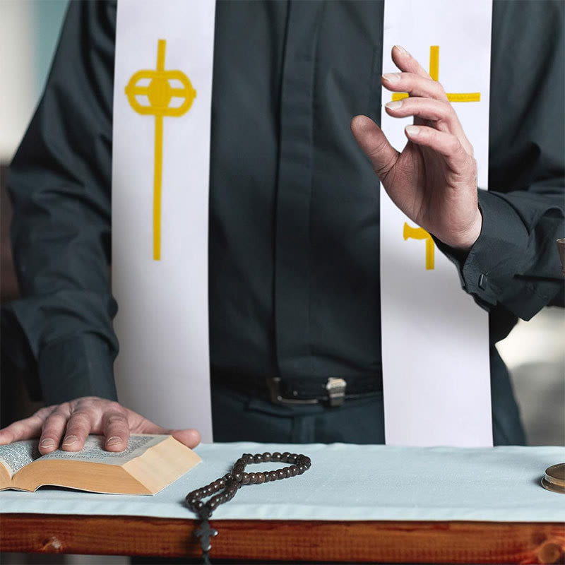L'étole d'un blanc immaculé, ornée d'une croix et d'une colombe dorées, proclame le message éternel de pureté et de grâce. Le blanc symbolise la sainteté et la résurrection, tandis que la colombe incarne la paix de l'Esprit, descendant comme un signe de la présence constante de Dieu.