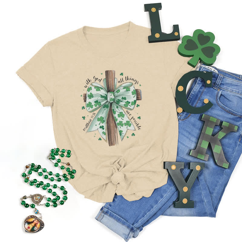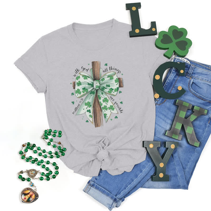 Célébrez la magie de la Saint-Patrick avec notre ravissant t-shirt « Avec Dieu, tout est possible ». Ce modèle allie avec élégance l'esprit de cette fête à un message profond de foi et d'espoir. Orné d'une délicate croix surmontée d'un nœud à motif de trèfle, il rend hommage à la riche tradition de la Saint-Patrick, symbolisant la chance, la foi et les bénédictions. Le verset inspirant de Matthieu 19:26 nous rappelle avec douceur qu'avec la grâce de Dieu, tout est possible. Portez ce t-shirt comme un gage de bénédiction divine et laissez-le emplir votre journée du véritable esprit de la Saint-Patrick : joie, foi et une touche de magie.